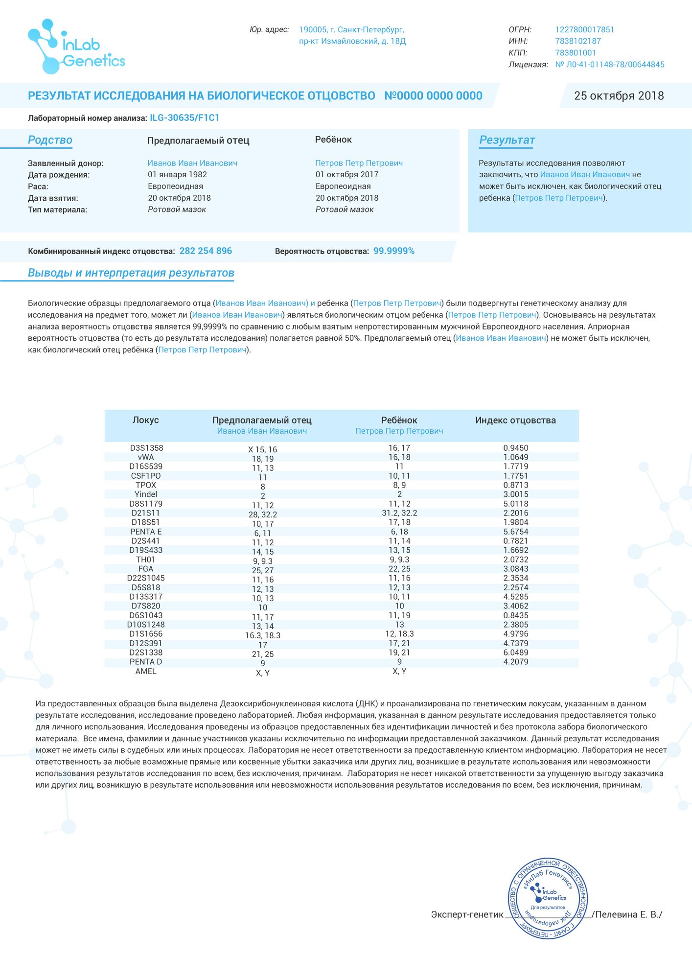 Благодаря использованию самого высокотехнологичного оборудования, проверенных методик и научно-технических разработок, ДНК-тесты для установления отцовства мы можем проводить без участия образцов от матери (достаточно только ДНК образцы от отца и ребенка). Если вам требуется ДНК-анализ с проведением генетической экспертизы для суда, генетики могут провести судебную экспертизу с оформлением полного комплекта документов и развернутого экспертного заключения.
